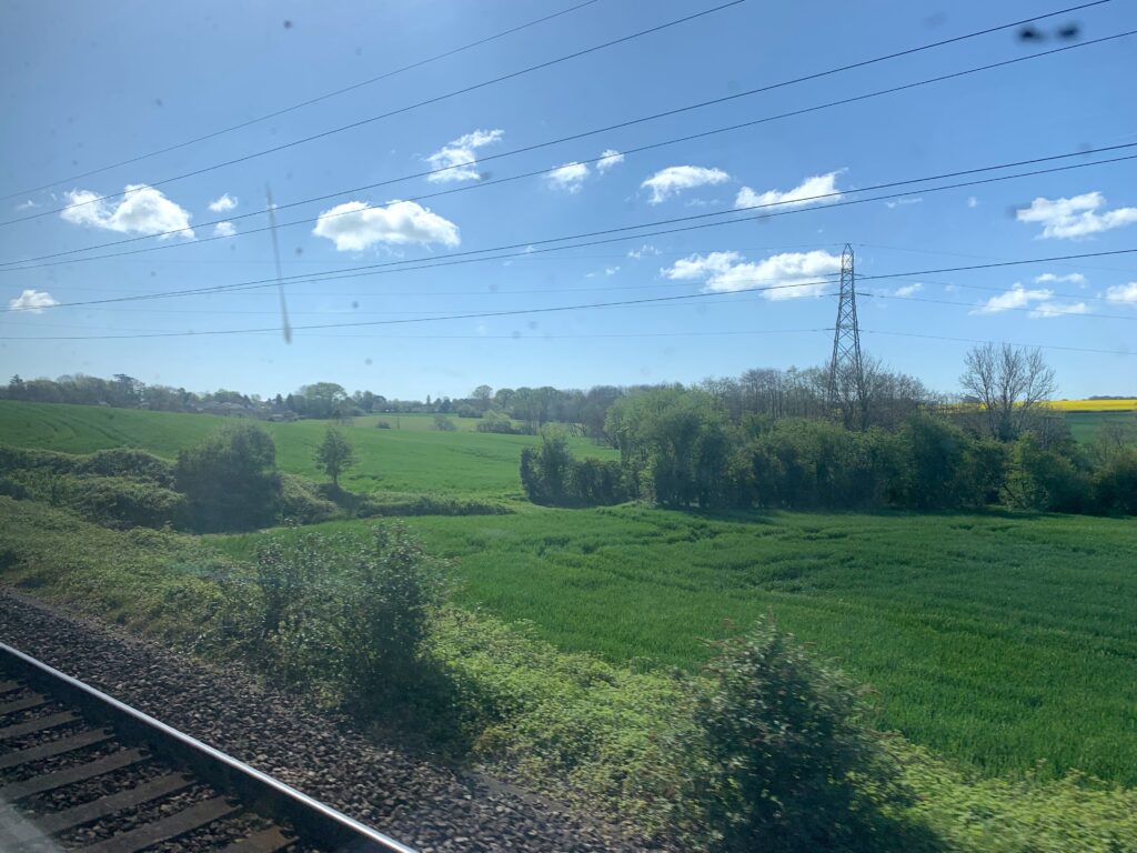 Die Landschaft, sofern man sie denn sieht, ist eher monoton. Grüne Felder und Wiesen, von Hecken durchsetzt, manchmal etwas Marschland. Saubere Scheiben gibt’s an dem Zug übrigens nicht.