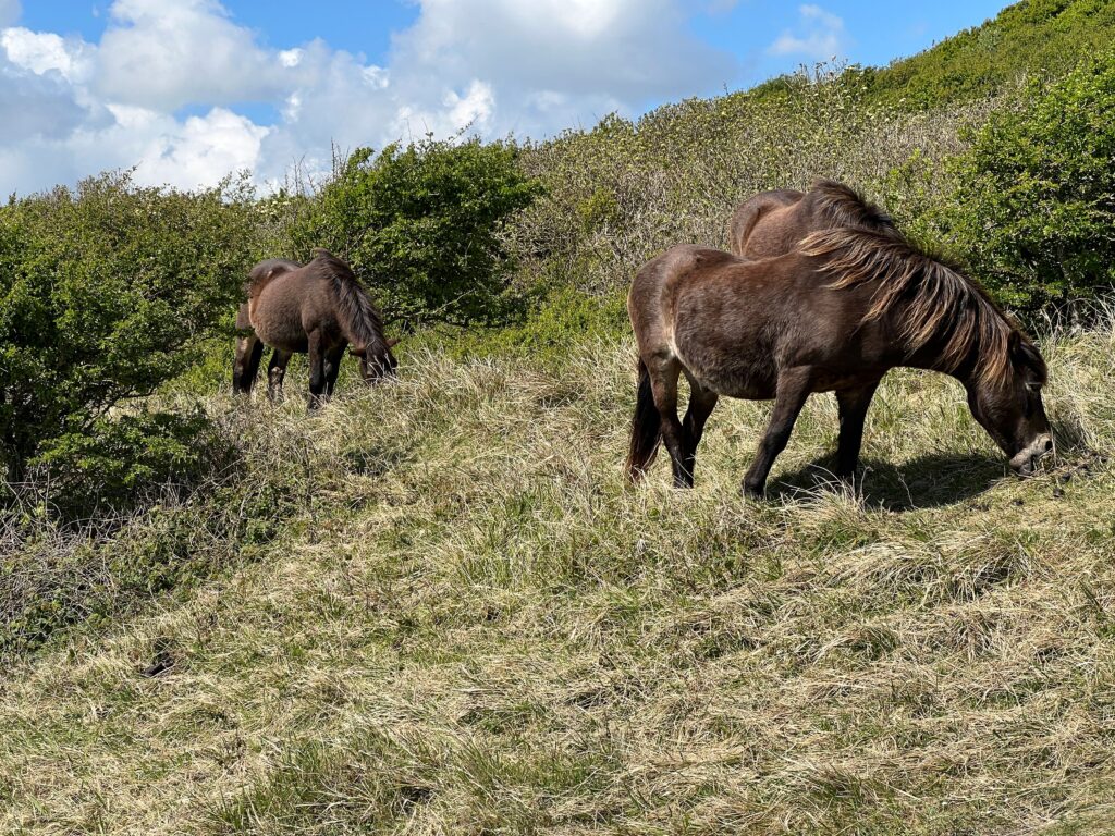Unterwegs begegnen wir Ponys, die hier friedlich grasen.