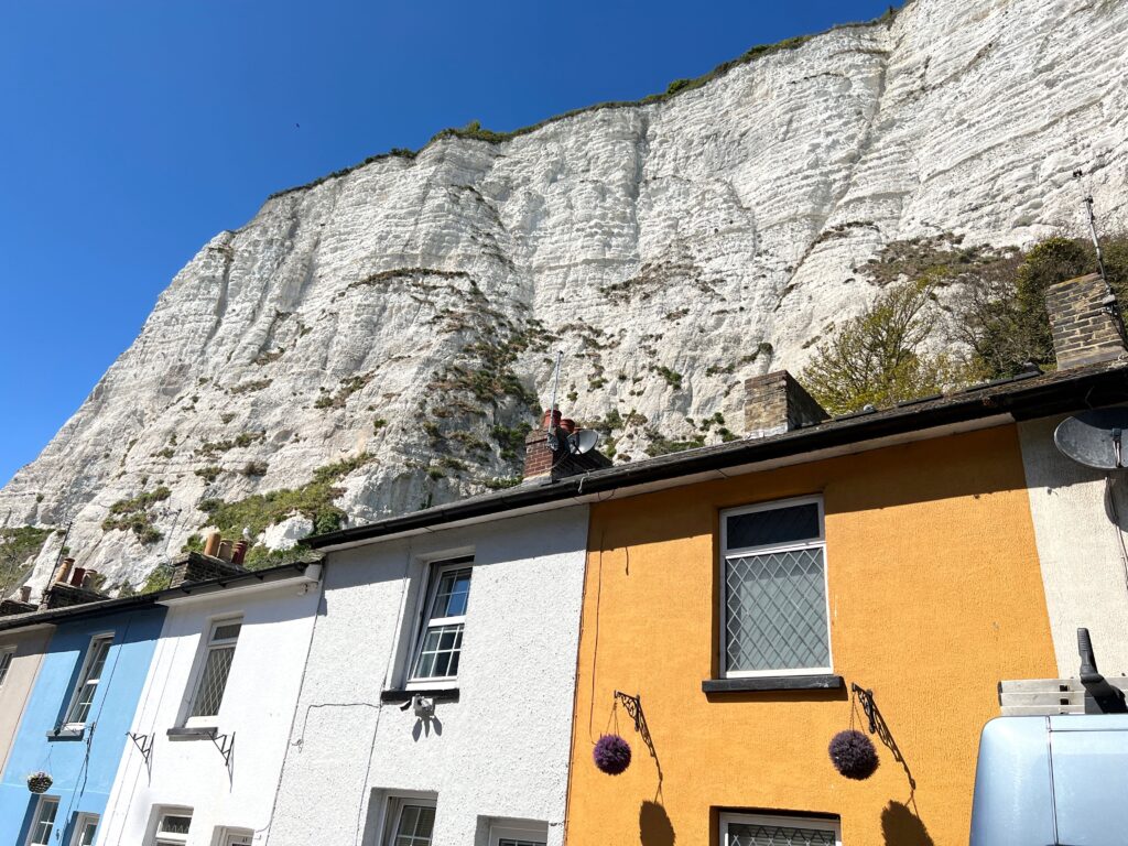 Unten angekommen, führt der Weg durch eine kleine Häuserzeile am Fuss der Klippen.