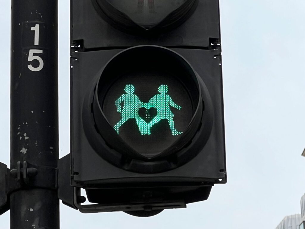 Die Ampeln rund um den Trafalgar Square sind nach dem Motto „Liebe ist Liebe“ gestaltet. Es gibt jegliche Kombinationen von Männlein und Weiblein, die sich die Hände halten und daraus ein Herz bilden.